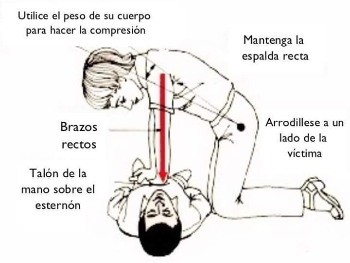 - Como aparece en la figura con los brazos perfectamente estirados, (no realizaremos fuerza con los brazos, sino que dejaremos caer el peso de nuestro tronco sobre el tórax de la víctima), comprimiendo así el esternón unos 5 cm aproximadamente.