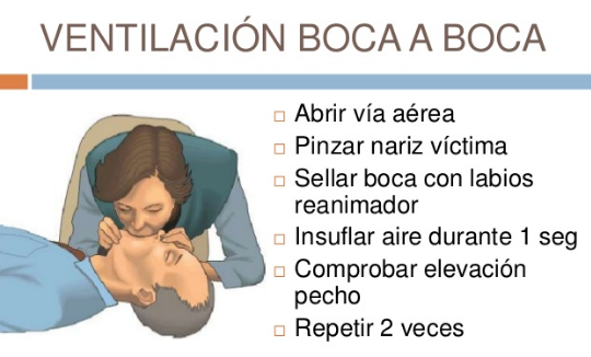 - Se tapará o pinzará la nariz con los dos dedos y se acercará la boca de forma perpendicular a la boca del paciente sellando con sus labios e insuflando el aire boca a boca.