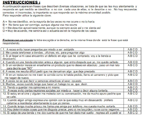 Se le pide al individuo que rellene este cuestionario para saber el grado de asertividad que tiene. Se le indica que al recibir el resultado del test podrá acceder a un archivo adjunto que contiene un práctico seminario sobre las habilidades sociales y la asertividad, donde encontrará extensa información y consejos prácticos para mejorar sus relaciones sociales.